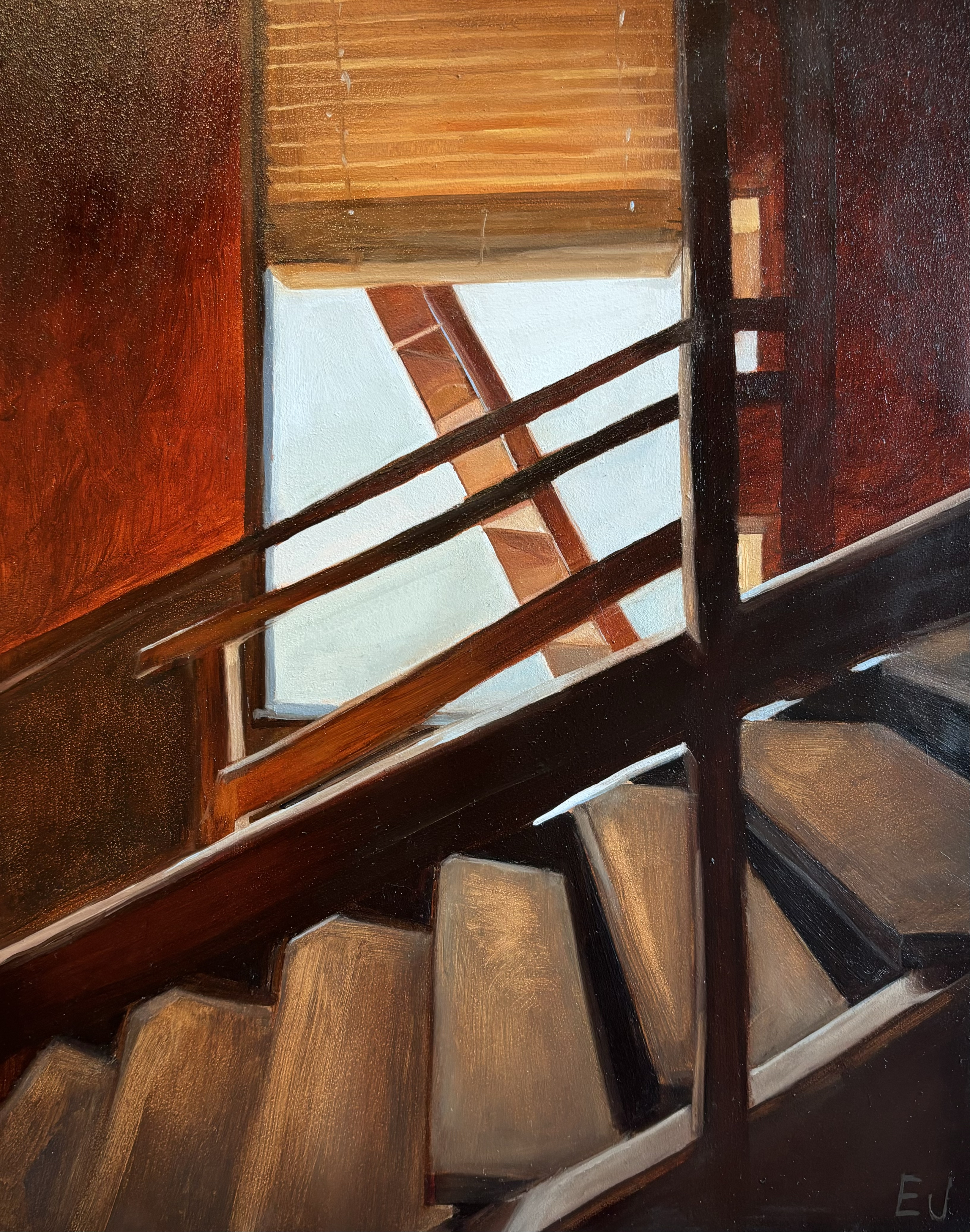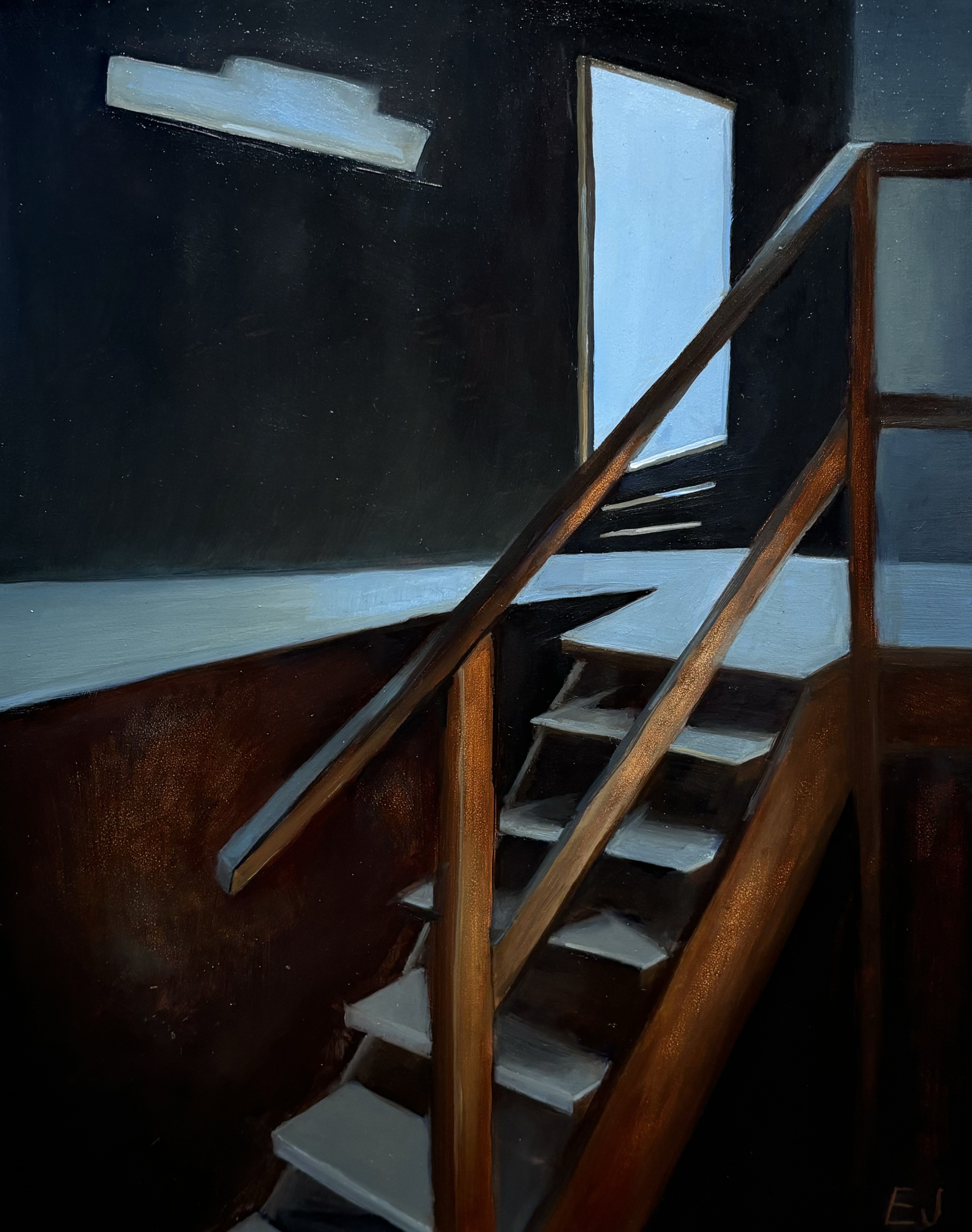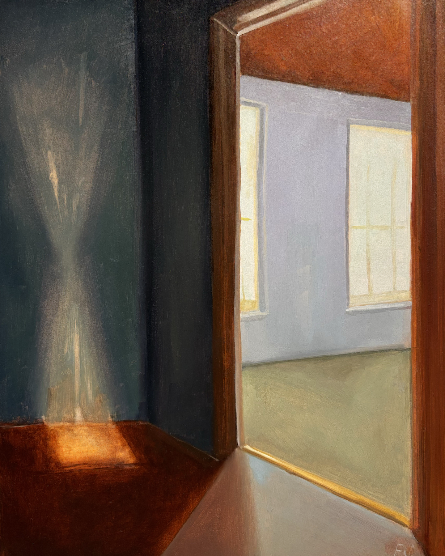 Ella Jennings paints luminous interiors as settings to encounter God. Her subject matter often features domestic spaces drawn from familiar locations, such as her childhood home. The everyday buildings we frequent are often imbued with nostalgia, memories, and emotional states based on our experiences in those places. Although Jennings draws inspiration from specific rooms, she pares down the composition to only the essentials — structures, shapes, and shadows. In this way, the works become settings for viewers to project their own associations with the spaces and metaphorically “walk” their own dwellings, where each viewer has the opportunity to encounter the Divine. Jennings draws inspiration from American realism and the geometry of precisionism.