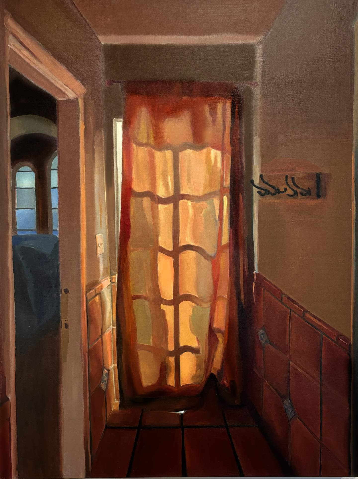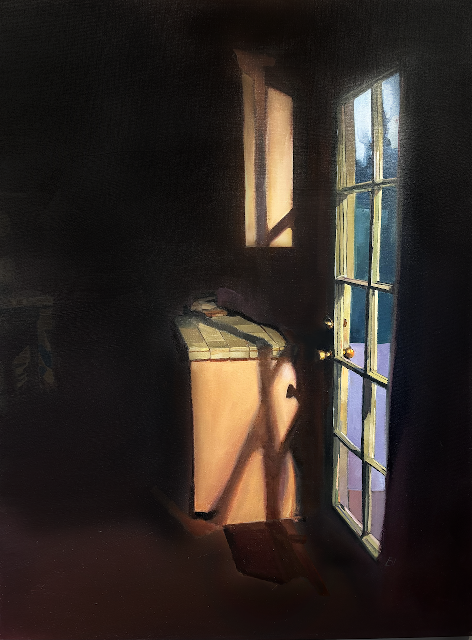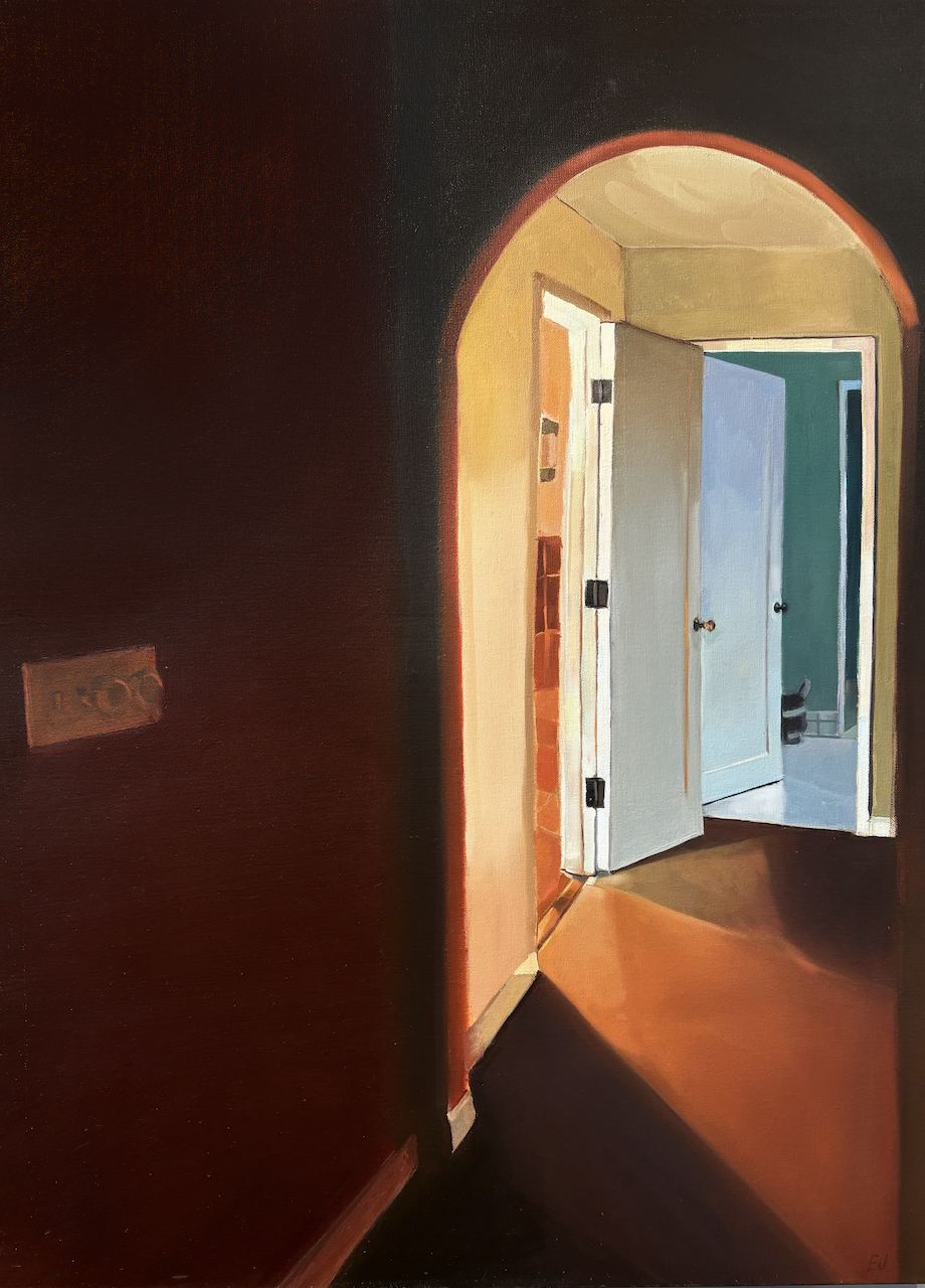 Simple forms and subject matter command a sense of stillness; if we pause long enough, even an ordinary house rewards us with sincere beauty. My work seeks to invite an attitude of reverence for familiar spaces and the solace they provide. By using images from my childhood home enveloped in early morning darkness, a feeling of simultaneous comfort and longing emerges. Half-open doors might suggest the presence of another, and although the rooms are empty, they are not lonely.